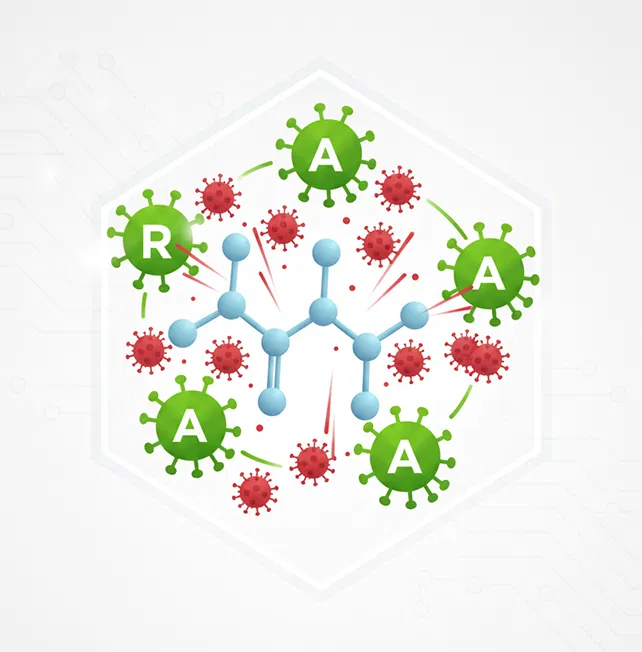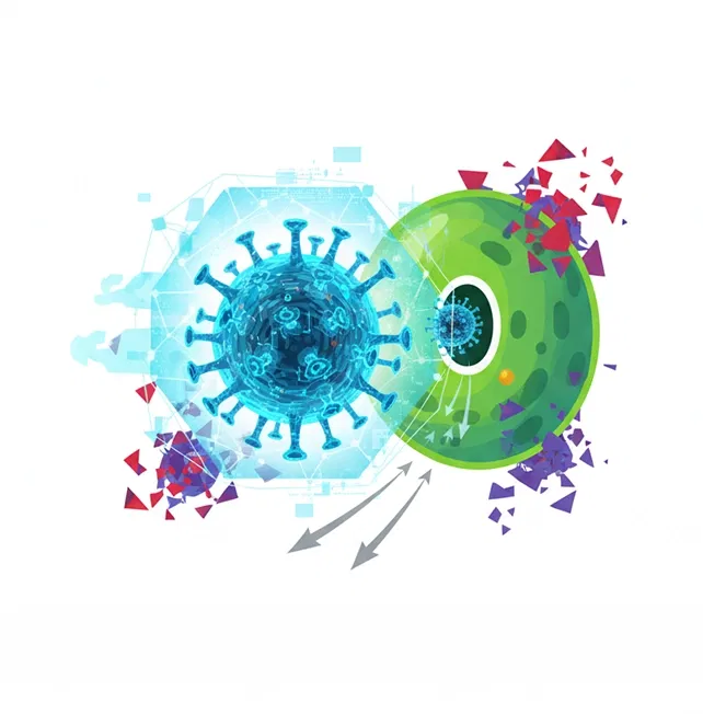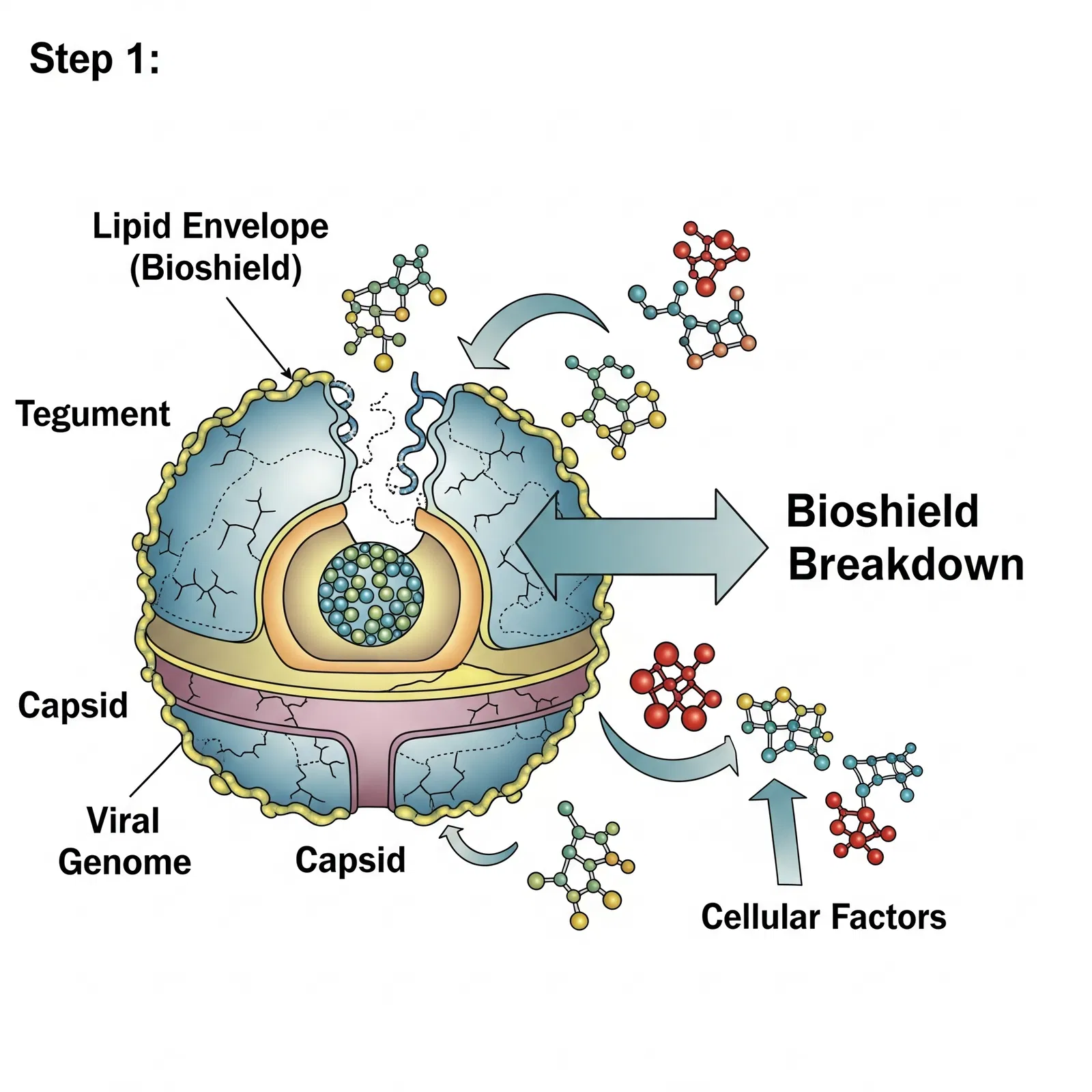acts in three stepsFirst, it targets the virus's protective mechanism, the bioshield, and breaks it down